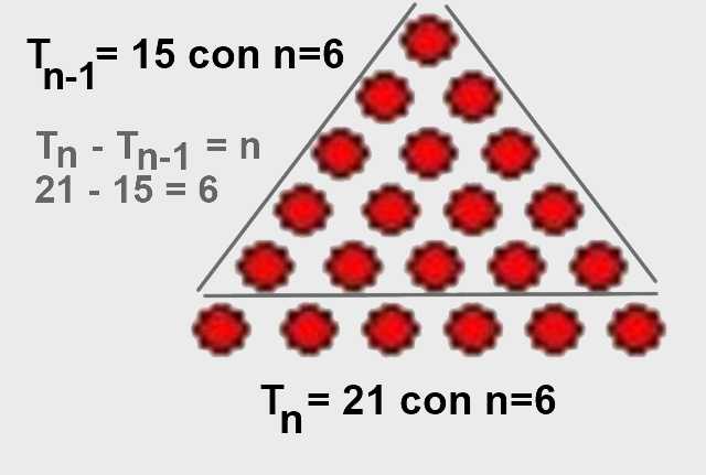 La diferencia del número triangular de orden n menos el número triangular de orden n-1 es n: