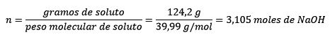 En este problema los 124,2 gramos de NaOH tendrán que ser convertidos en moles (para moles de soluto) y un litro de agua tendrá que ser convertido en kilogramos (por kilogramos de disolvente) usando la densidad.
