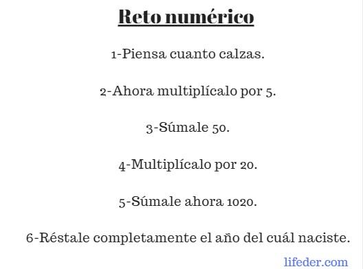El resultado son los dos primeros dígitos es el número de talla de zapato que tienes y los dos restantes es tu edad ¿Estás impresionado? Reta y juega con tus amigos de WhatsApp.