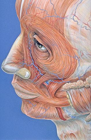 Por su parte los músculos de la cara son de menor tamaño. Sus fibras en muchos casos carecen de inserciones óseas, y su función principal es tomar parte de la expresión facial. Por ello, suelen ser llamados también los “músculos de la mímica”.