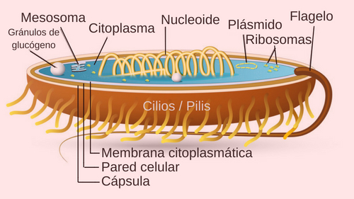 Algunas bacterias poseen también flagelos, cilios o pilis, filamentos o estructuras que ayudan a la célula a moverse o adherirse sl medio en el que se encuentra.